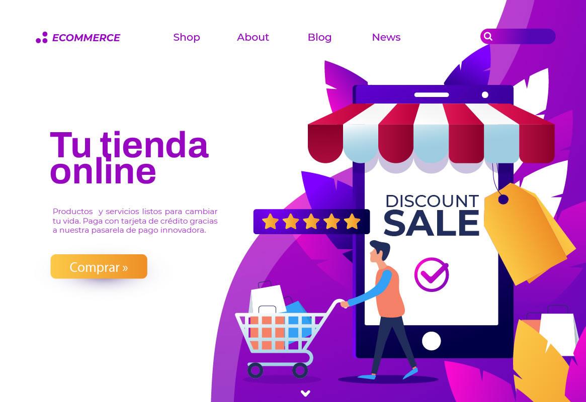 Una tienda en línea que vende productos físicos o servicios 24/7. Incluye integración con pasarela de pago para cobrar por tarjeta de crédito y otros métodos.